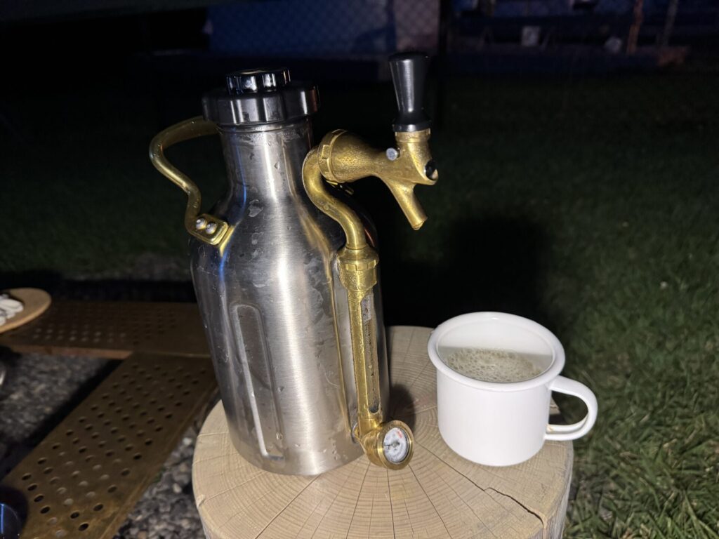 暗くなったころ、施設でいただいたクラフトビールを外で一杯。